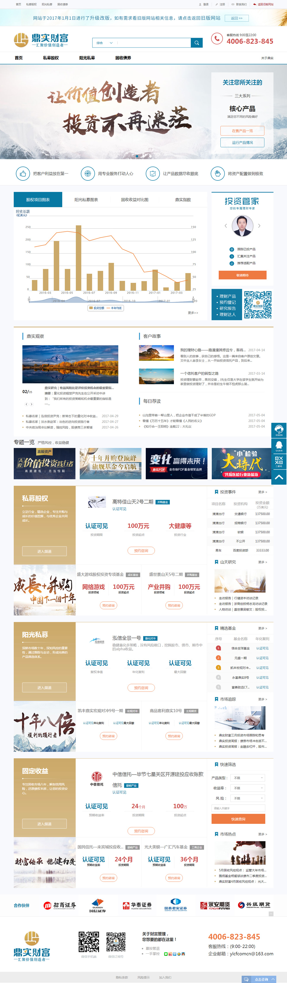 基于對(duì)一、二級(jí)市場的深刻理解,到目前為止我們形成了覆蓋多個(gè)市場的產(chǎn)品線。一級(jí)市場方面,我們與國內(nèi)多家知名PE、VC機(jī)構(gòu)達(dá)成長期戰(zhàn)略合作;針對(duì)具體項(xiàng)目,我們均深入具體項(xiàng)目端,追求對(duì)企業(yè)價(jià)值與成長邏輯的全面了解與判斷;已對(duì)多家企業(yè)進(jìn)行了股權(quán)投資。二級(jí)市場方面,與國內(nèi)大多數(shù)知名陽光私募機(jī)構(gòu)有溝通或合作,已連續(xù)發(fā)行數(shù)期二級(jí)市場組合基金。通過我們自身研究團(tuán)隊(duì)對(duì)大宗商品、股票、債券、金融衍生品的理解與跟蹤,在不同時(shí)期對(duì)資產(chǎn)組合進(jìn)行合理地配置與布局;一直為客戶取得穩(wěn)健的資產(chǎn)回報(bào)。