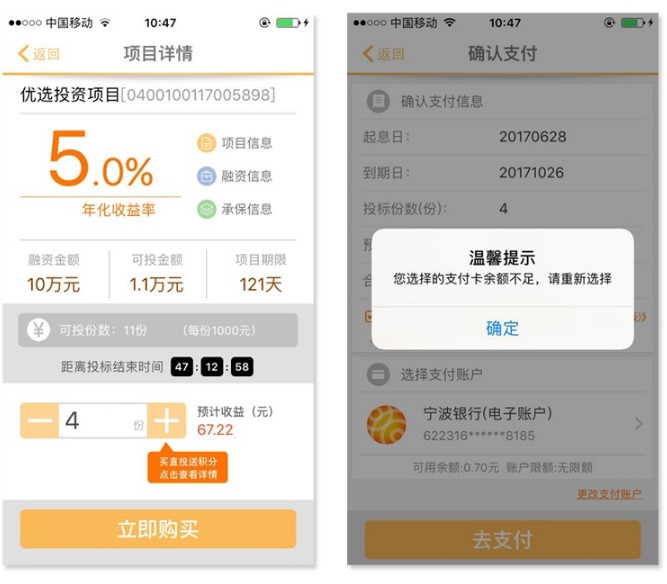 以寧波銀行直銷銀行為例,當(dāng)你想購買 4000 元的直投項目的時候,點擊「立即購買」按鈕,進入「確認支付頁面」,點擊「去支付」按鈕,這時候彈出一個對話框,告訴你賬戶余額不足。具體多少余額也沒有說清楚,你立馬去「我的賬戶」里看了余額再返回購買,這時發(fā)現(xiàn)項目都被人搶光了,瞬間奔潰。