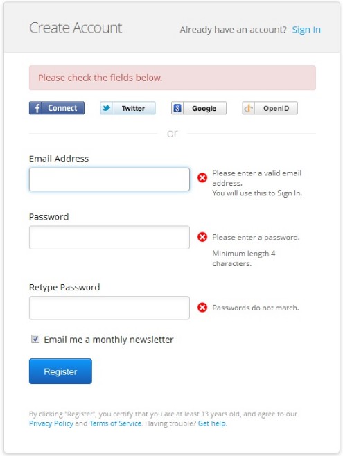 現(xiàn)在還有很多設(shè)計師開始將錯誤提示做成文字標(biāo)簽形式,將其和控件放在一起。這樣子用戶就可以很容易的讀取錯誤信息,一眼就能看出來哪里出錯了,不用根據(jù)提示的控件名稱去尋找出錯的位置,因為錯誤提示就在發(fā)生錯誤控件的旁邊。此外還很容易改正,因為用戶不用再跳轉(zhuǎn)頁面或去記那些冗長的錯誤信息。